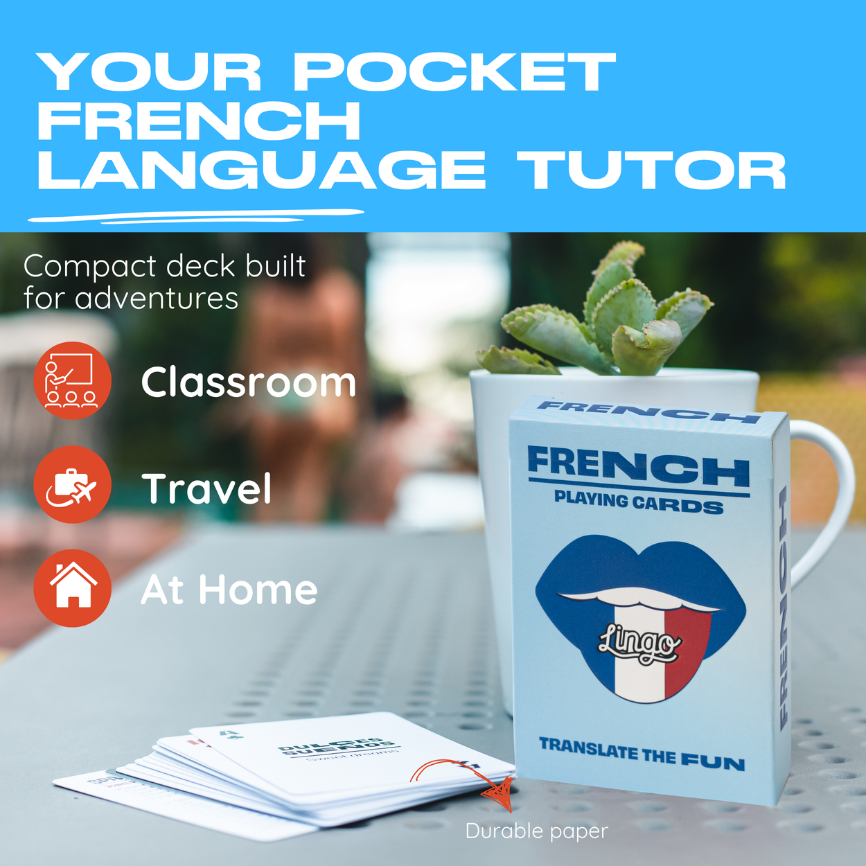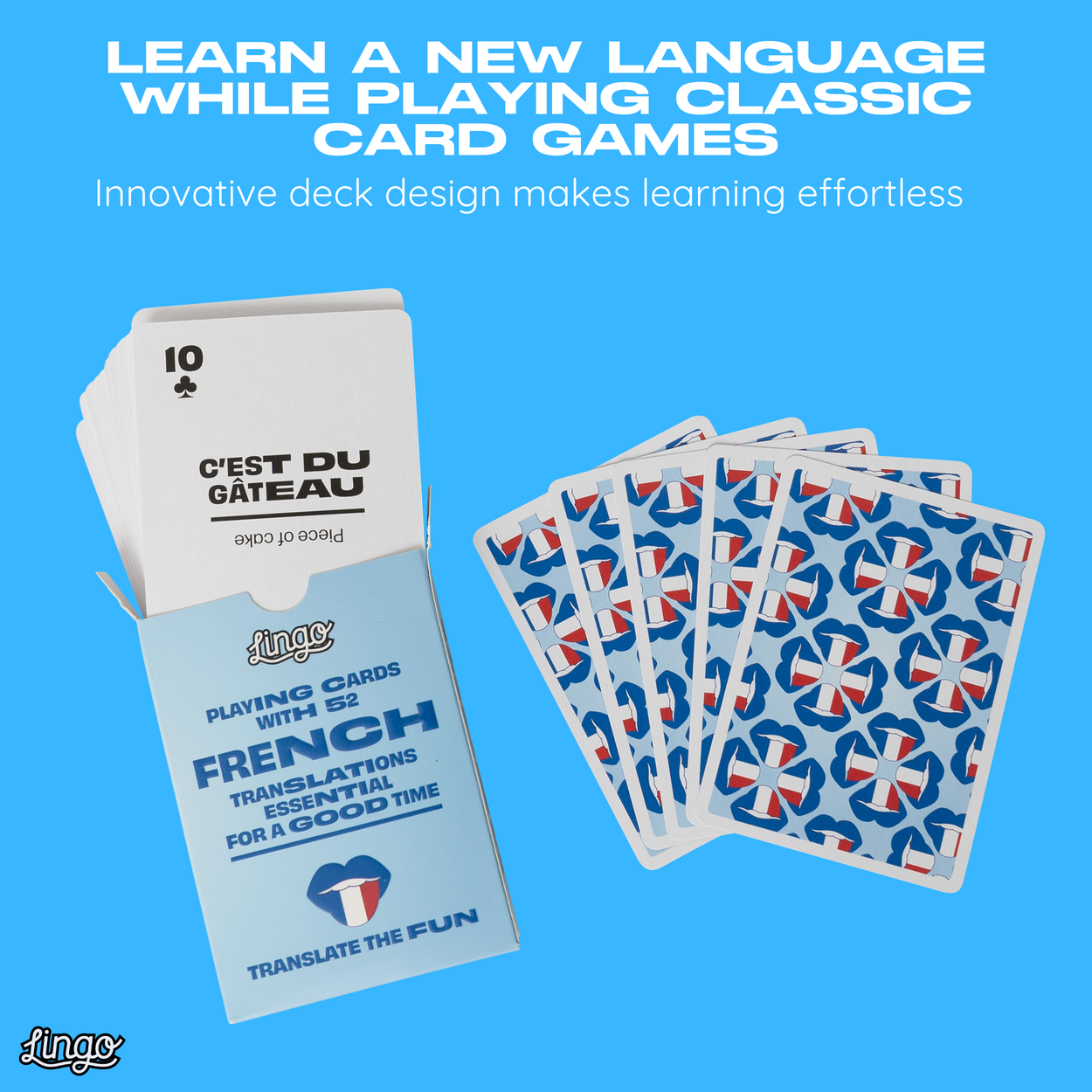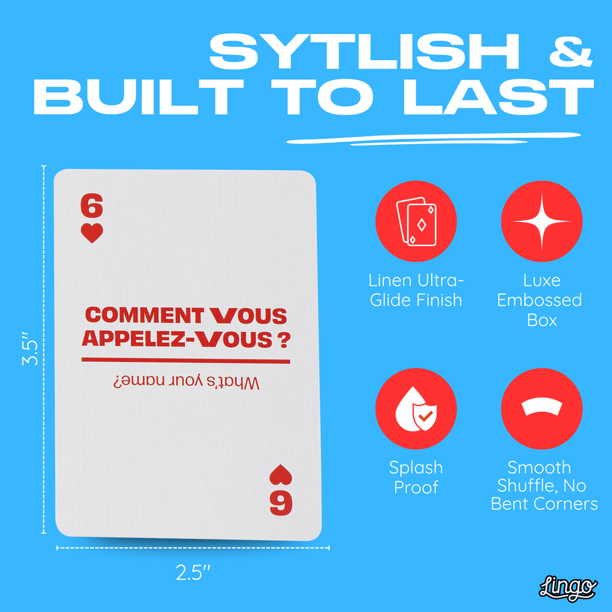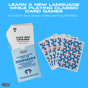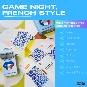 Say bonjour to effortless learning with French Lingo Playing Cards — a chic blend of culture, travel, and classic gameplay. Each card features a beautifully designed French word or phrase with its English translation, helping you pick up the language naturally while you play. Perfect for Francophiles, travellers planning a Parisian escape, or anyone who loves adding a touch of sophistication to game night, this compact deck makes learning feel très élégant. Ideal as a gift or travel companion, it turns every shuffle into a step closer to la belle vie. Bon voyage!