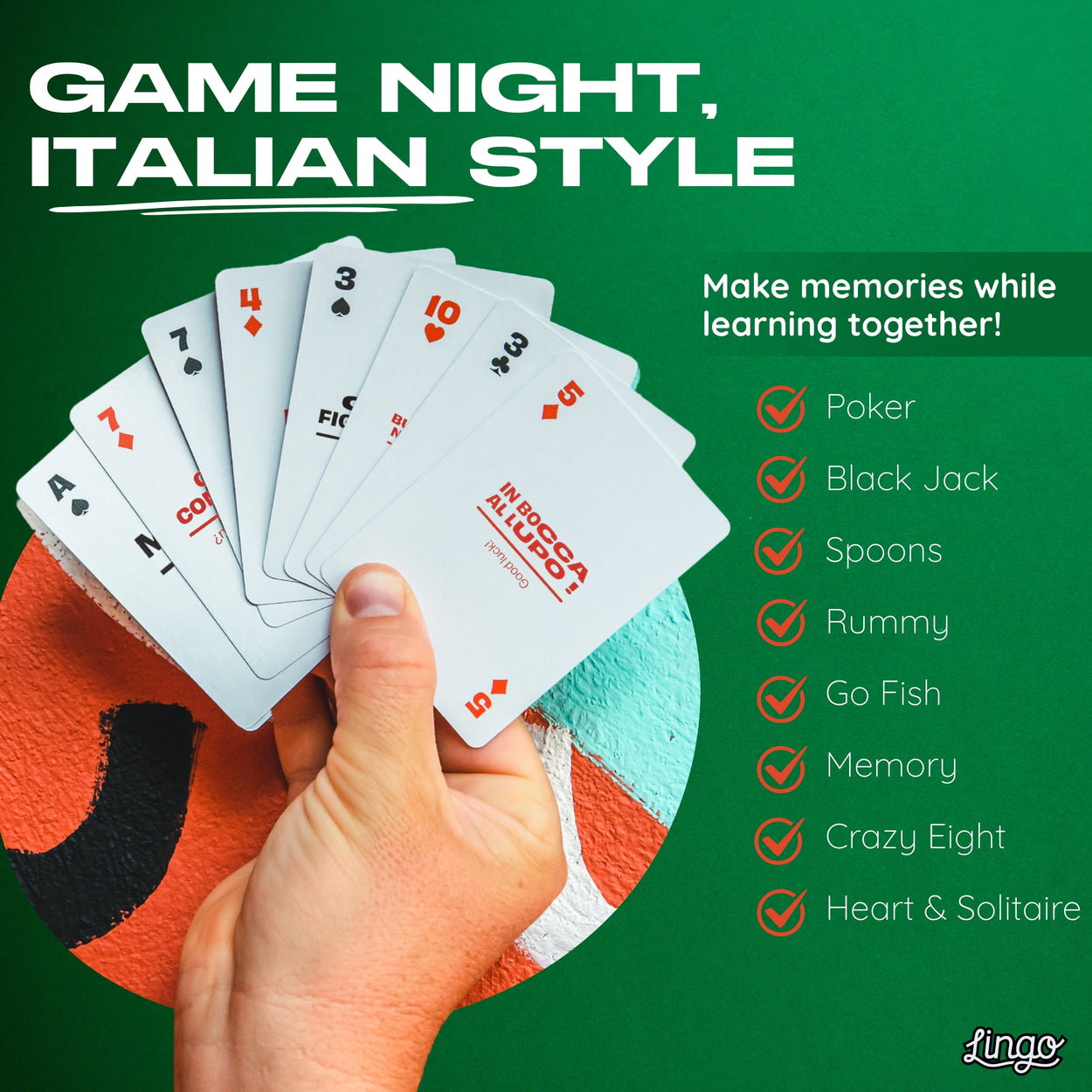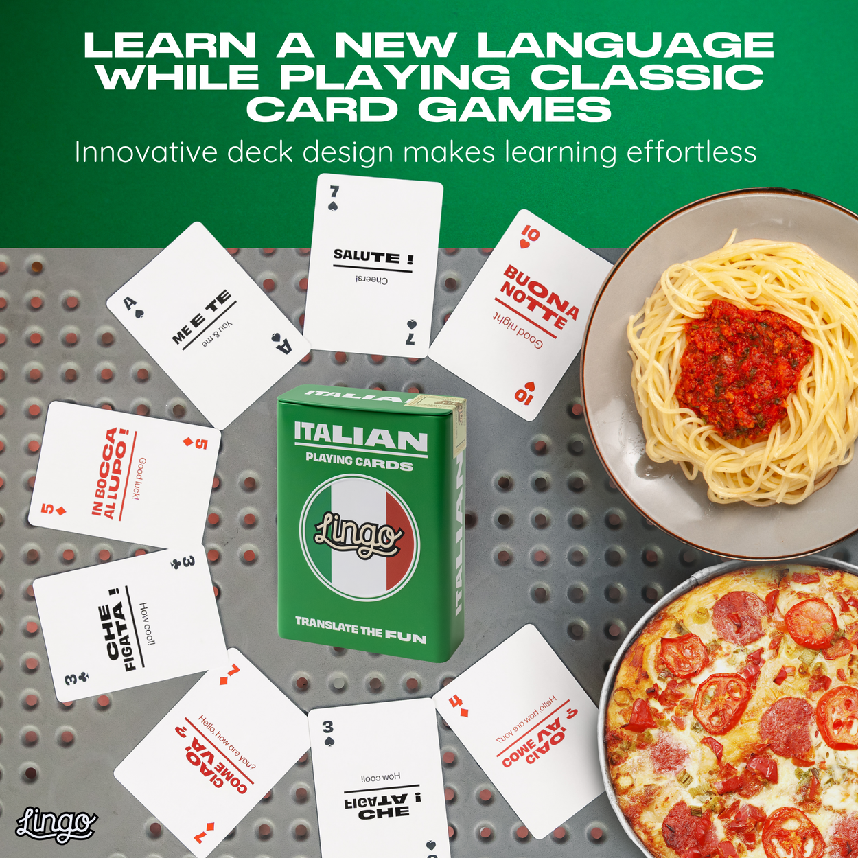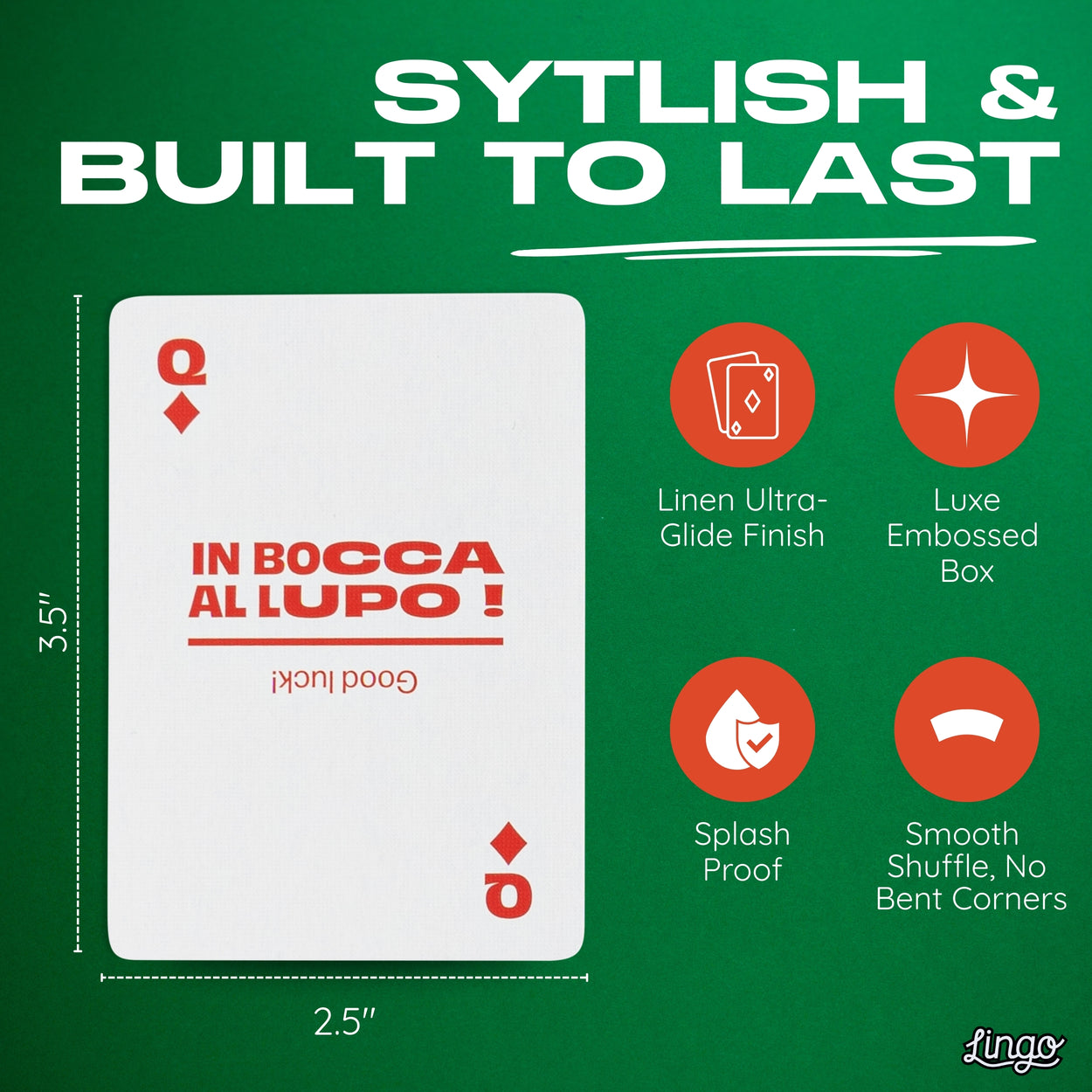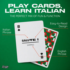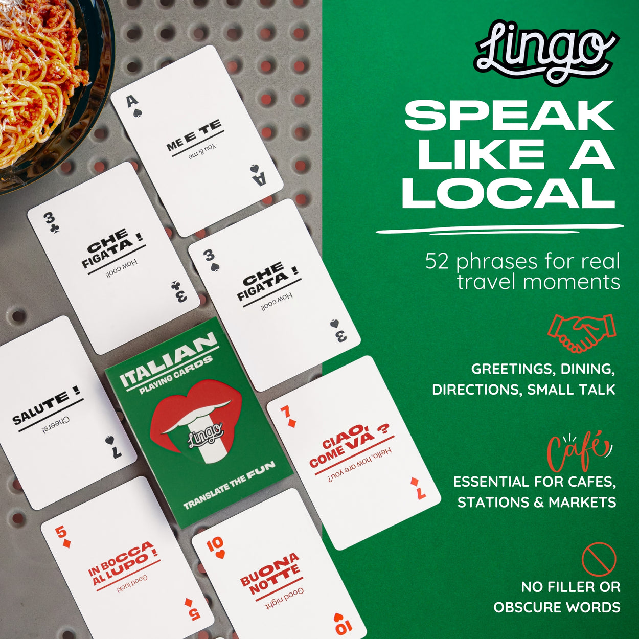 Say ciao to the most stylish way to learn Italian with our Italian Lingo Playing Cards. Each card features a useful Italian word or phrase with its English translation, making it easy to pick up vocabulary naturally while you play. Perfect for travellers heading to Italy, language lovers, Italian-Americans reconnecting with their roots, or anyone dreaming of la dolce vita. Compact and beautifully packaged, it’s an ideal gift or travel companion. Explore the language of pizza, pasta, and passion — one card at a time.