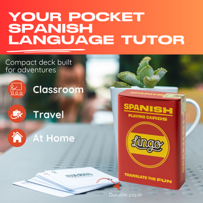 Join over 500 million Spanish speakers worldwide with our Spanish Lingo Playing Cards — the fun way to learn essential phrases while you play. From ordering “una cerveza” to greeting new amigos with a confident “¡hola!”, this deck helps you communicate naturally across Spain, Mexico, and Latin America. Perfect for travellers, language learners, or anyone wanting to connect with Hispanic culture, these cards make learning effortless — one shuffle at a time. Raise your glass and say it the local way: ¡Salud!