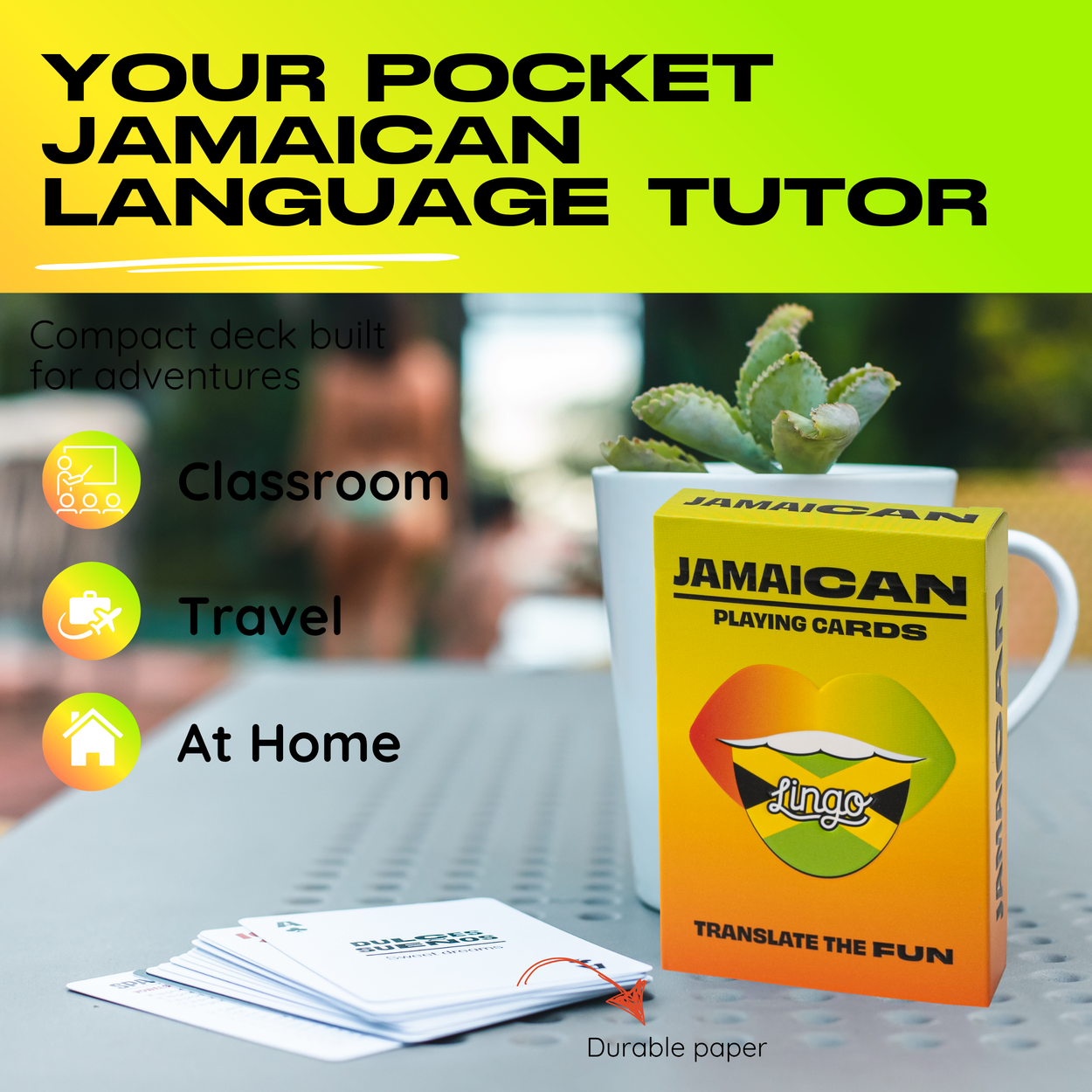 Feel the rhythm of the islands with our Jamaican Slang edition — your passport to authentic Caribbean language and culture. Learn classic expressions like “wah gwaan” (what’s up?) and “irie” (everything’s good) as you soak up the spirit of reggae, sunshine, and laid-back island life. Whether you’re planning a trip to Jamaica, reconnecting with Caribbean roots, or just want to talk like a true yardie, this deck helps you speak in real Jamaican patois — not tourist talk. Perfect for music lovers, foodies obsessed with jerk chicken, or anyone craving feel-good vibes and cultural connection. Respect, mi bredren!