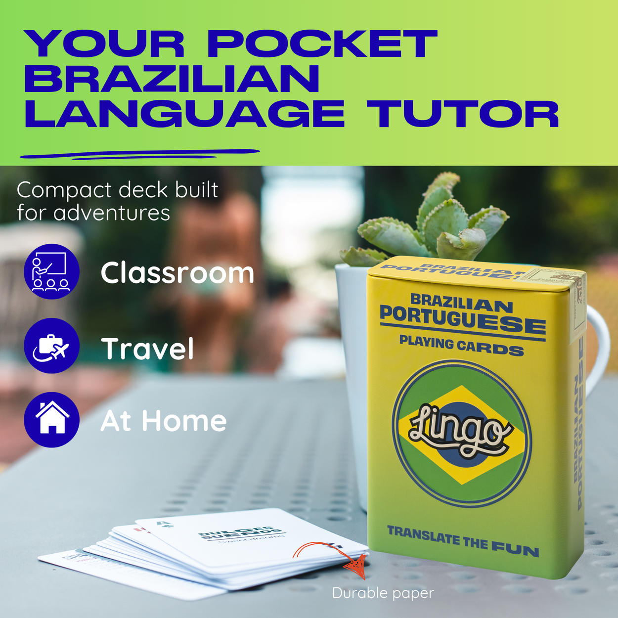 Experience the energy of Brazilian Portuguese with our Brazil Slang edition — your key to connecting with the music, culture, and joyful spirit of Brazil. Learn everyday phrases like “Oi” (Hi) and playful slang heard in the streets of Rio, São Paulo, and Salvador. Whether you’re dancing to samba, celebrating Carnaval, or simply dreaming of sunshine and beach life, this deck helps you speak like a local and feel the rhythm of Brazil from the inside out. Perfect for travellers, language learners, or anyone who loves Brazilian food, music, and passion. Viva o Brasil!