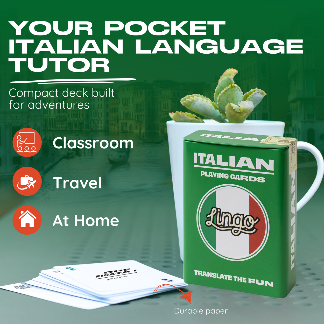 Say ciao to the most stylish way to learn Italian with our Italian Lingo Playing Cards. Each card features a useful Italian word or phrase with its English translation, making it easy to pick up vocabulary naturally while you play. Perfect for travellers heading to Italy, language lovers, Italian-Americans reconnecting with their roots, or anyone dreaming of la dolce vita. Compact and beautifully packaged, it’s an ideal gift or travel companion. Explore the language of pizza, pasta, and passion — one card at a time.